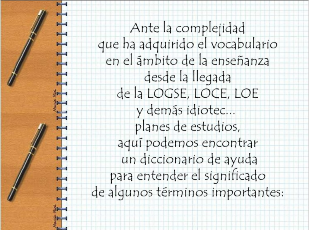 Queda poco para entrar en el colegio y Silvia Asuero me han enviado esta presentación con una serie de términos educativos. Hay que leerlo con sentido del humor, que para algo es ese sentido y si no lo tienes no lo leas.