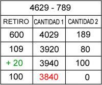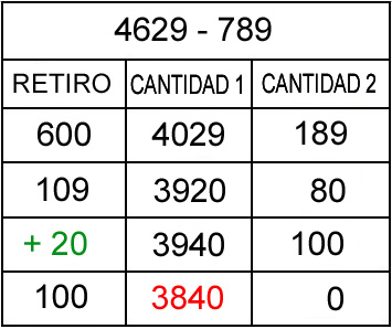 Para su realización mediante el algoritmo ABN básicamente iremos quitando cantidades del minuendo y del sustraendo hasta agotar el sustraendo. Para ello necesitaremos tres columnas, en la 1ª reflejamos la cantidad que vamos quitando de las otras dos, y en las 2a y 3ª indicaremos las cantidades del minuendo y sustraendo y debajo paulatinamente las cantidades que resultan tras quitarles la de la 1ª columna.