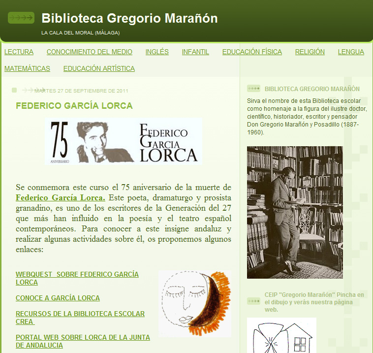 Con motivo del  75 aniversario de la muerte de  Federico García Lorca,  Encarni Valderrama nos informa que ha creado una entrada para trabajar este evento desde la biblioteca del Ceip Gregorio Marañón en La Cala del Moral (Málaga).