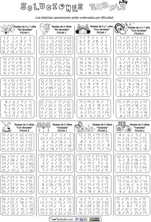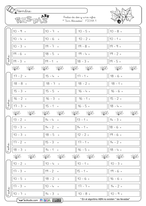 Restas 2 cifras variadas (con y sin llevadas, 2 y 1 cifras) (Ficha-01)