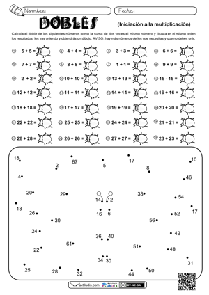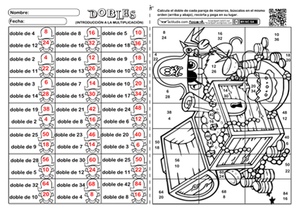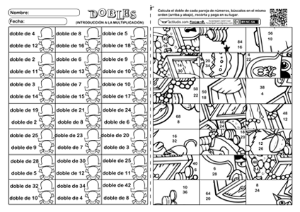 En esta ficha se presentan dos dobles por casilla,. En ella números hasta el 12 se repiten en varias de ellas, para afianzar el producto por 2.