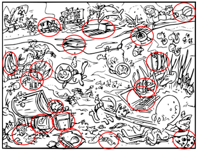 La siguiente imagen la encontré en el blog «team-spectacular» de Scott Wright, y la adapté un poco, quitándole el escaso color que tenía y aumentando el tamaño para que al imprimirla se viesen mejor los detalles. Se trata de un juego visual que ayudará a los críos desarrollar la concentración, observación, paciencia,… y a divertirse un rato. El original lo podéis encontrar aquí y la solución la tenéis al final del artículo.