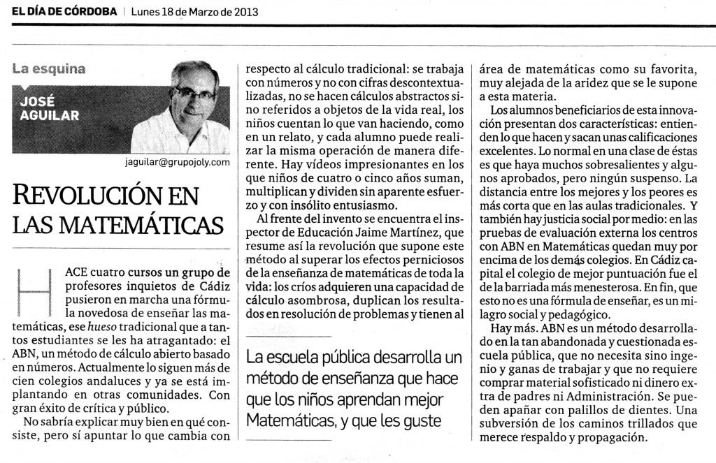 Artículo aparecido en los periódicos del grupo Joly, escrito por José Aguilar Villagrán, una de las firmas más solventes y prestigiosas de la prensa andaluza, opinando sobre el algoritmo ABN. Clic para agrandar.