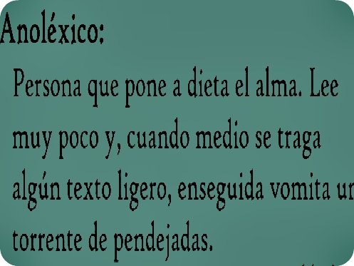 Tu estás aquí: Inicio › Frases Citas › Frase del día: «Anoléxico» ← A recuperar fuerzas en Semana Santa De abajo a arriba → Frase del día: «Anoléxico» Si tienes dudas sobre las donaciones, pulsa aquí dónde explicamos en qué consite y por qué son necesarias Leído en google+ de «Citas-Quotes VENEZUELA« Comparte esto:FacebookTwitterLinkedInCorreo electrónico Deja una respuestaTu dirección de correo electrónico no será publicada. Los campos obligatorios están marcados con *Comentario * Nombre * Correo electrónico * Web Recibir un correo electrónico con los siguientes comentarios a esta entrada. Recibir un correo electrónico con cada nueva entrada. Δ