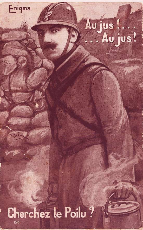 En la lámina dice «Cherchez le Poilu?» que significa literalmente ¿encuentras al peludo?. Pero «Poilu» era también el nombre que se les daba a los soldados franceses de la I Guerra Mundial, parece que por su habitual barba o bigote. Si encuentras al otro soldado, que por cierto no es «Poilu» puedes dejar tu respueta en los comentarios con el comando spoiler que se explica a continuación.
