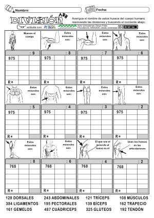 En ésta ficha trabajamos divisiones de tres cifras entre una con repaso de los principales músculos humanos y así lo complementamos con la anterior dedicada a los huesos.