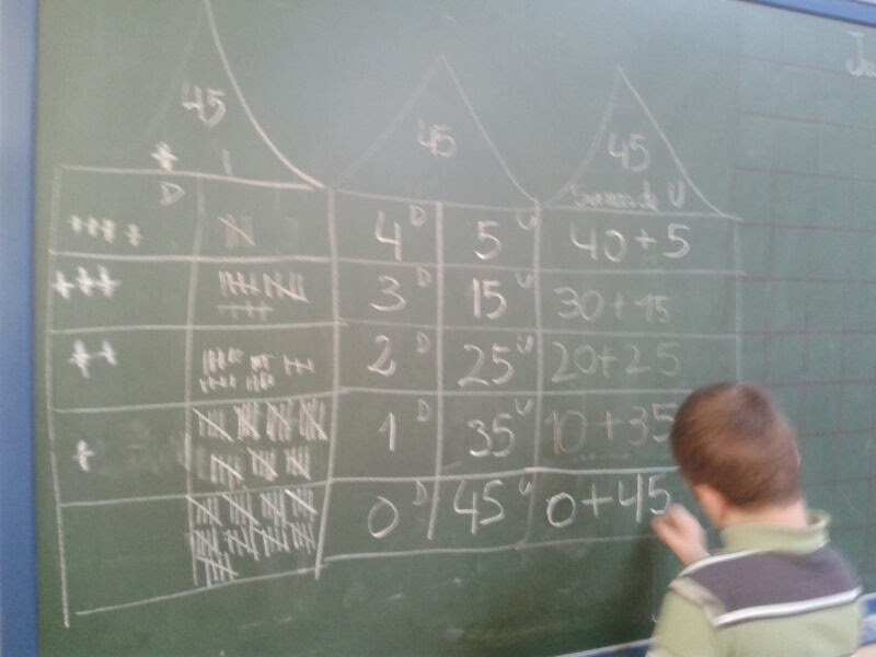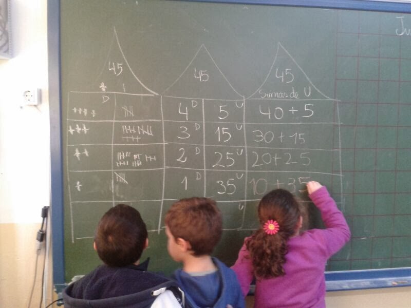 Los que trabajáis la numeración mediante le algoritmo ABN, o simplemente la descomposición numérica más allá de los que nos ofrece la enseñanza tradicional, ya conocéis las actividades mediante «las casitas de adosados«. En ésta ocasión os mostramos la ocurrencia de los alumnos de Primero del CEIP «Serafina Andrades” de Chiclana (Cádiz) los cuales han añadido una casita más para reflejar los palillos que corresponden a cada una de las descomposiciones.