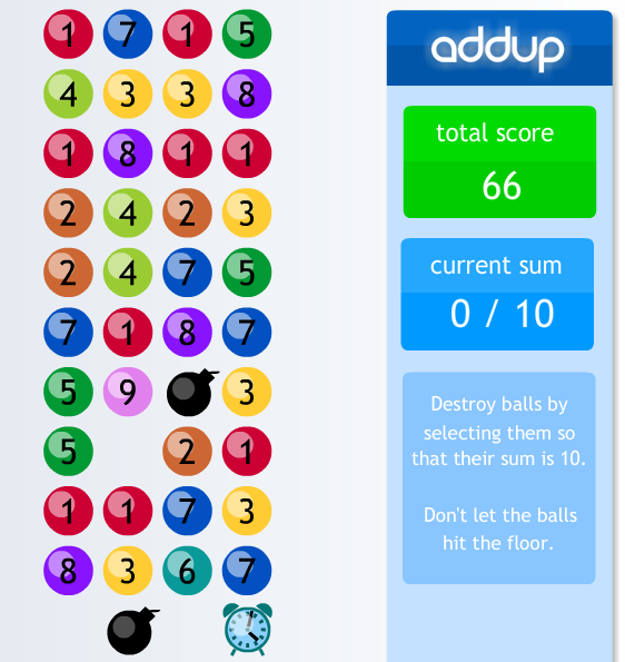 Hay que evitar que los círculos lleguen al fondo de la pantalla haciendo clic sobre los círculos que sumen 10. Debes tener en cuenta que el tiempo va aumentando de velocidad conforme pasa el juego. Si la música te molesta por repetitiva puedes desconectarla en el icono del sonido.