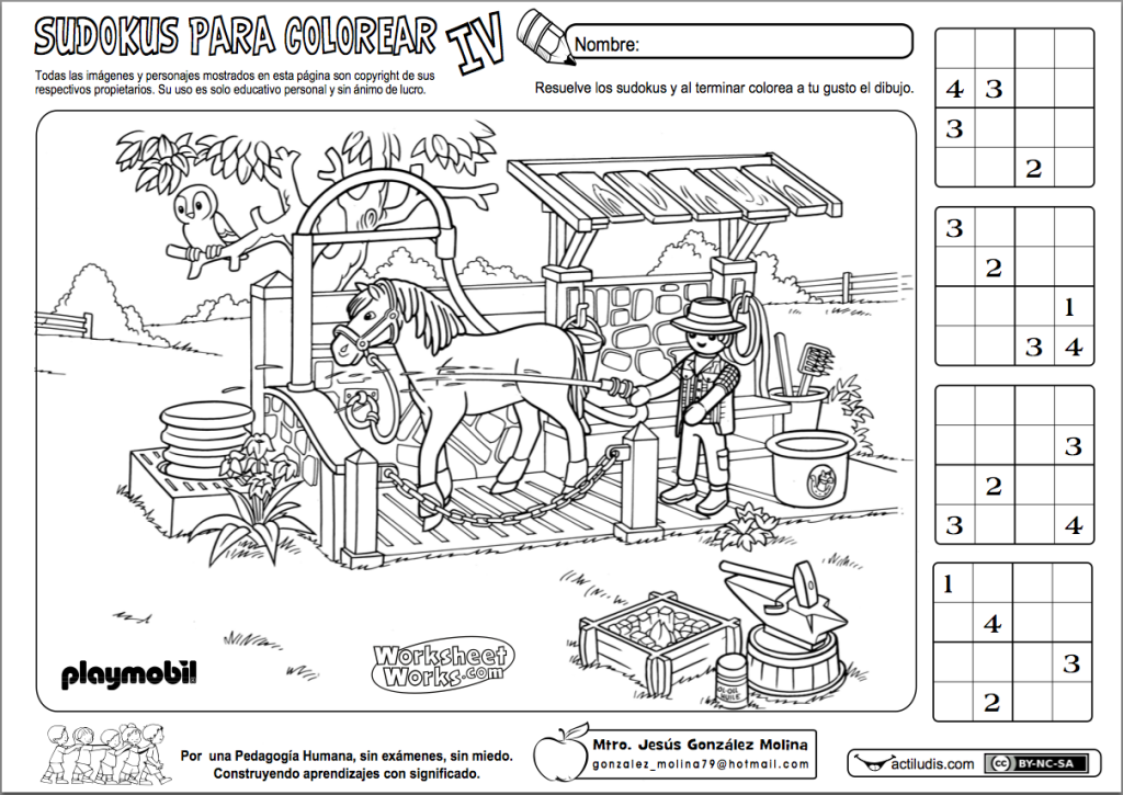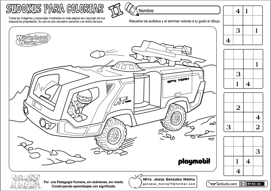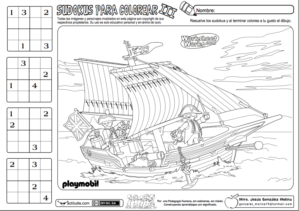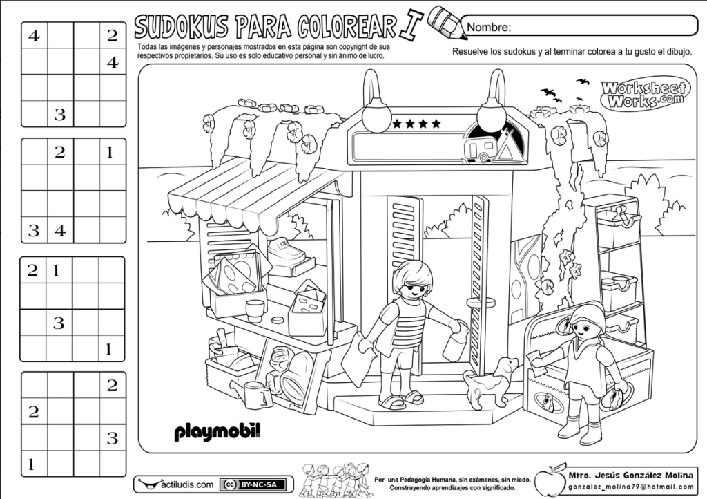 En esta ocasión para trabajar sudokus con números del 1 al 4 en celdillas de cuatro. En total cuatro sudokus por ficha y un dibujo de playmobil para colorear. Se trata de sudokus muy sencillos para iniciar al alumnado en el cálculo reflexivo.