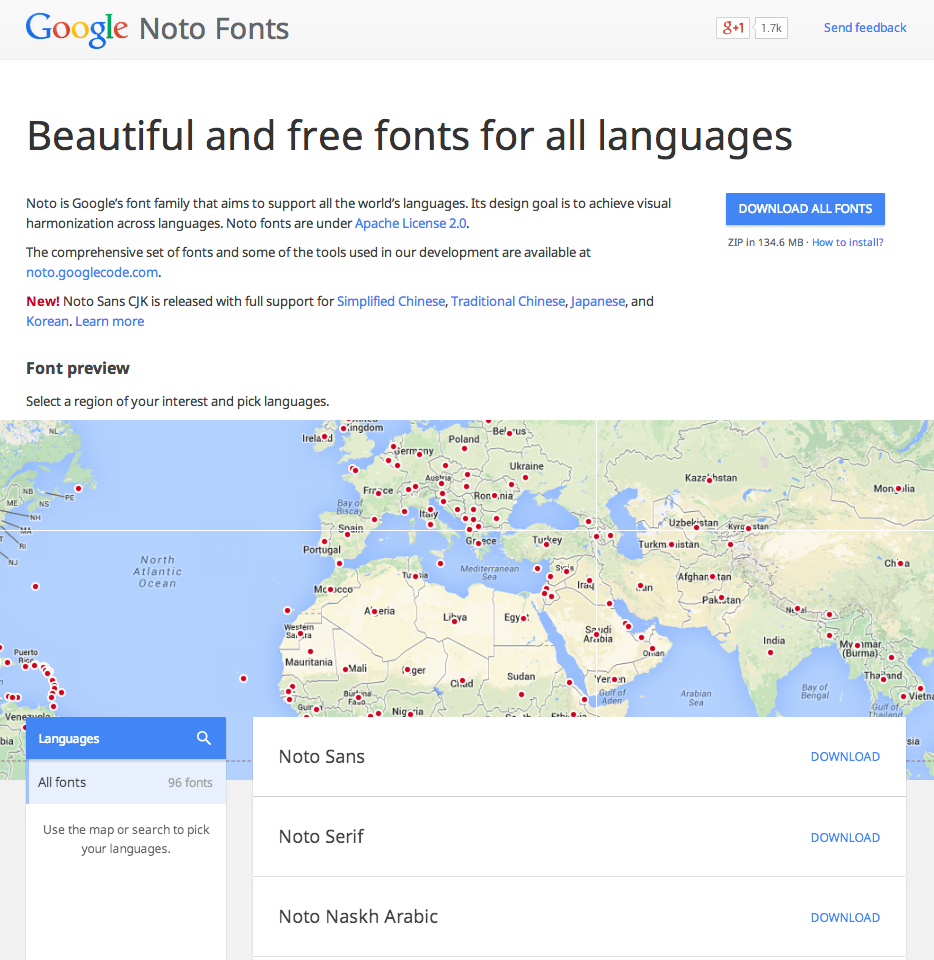 Para descargar las tipografías solo tienes que ir a la web oficial: google.com/get/noto y elegir una ubicación en el mapa interactivo que mostrará una selección de la versión ideal para tu idioma para poder descargar, o bien puedes descargarla absolutamente todas las variaciones haciendo clic en el botón que ves a la derecha.
