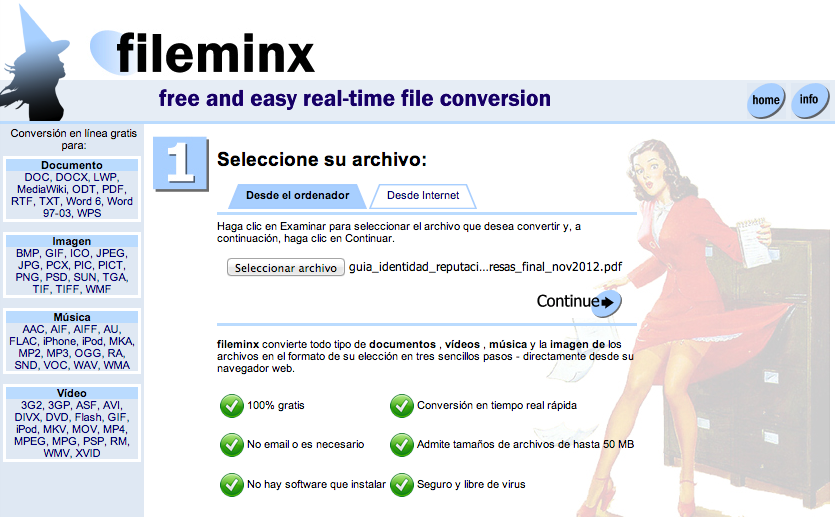 Una vez que has subido el archivo eliges las extensión en la que lo quieres convertir y una vez procesado se nos facilita un enlace de descarga del archivo con el nuevo formato. Sólo tienes que tener en cuenta que el tamaño máximo que admite es de 50 mb pero para documentos está bastante bien.