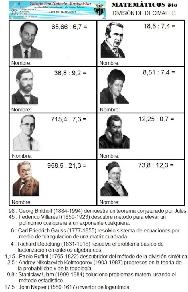Una ficha para trabajar divisiones con números decimales, realiza por Reynaldo Oswaldo Cartolín Rosado Profesor de Matemática – Física desde el Colegio San Antonio Marianistas del Callao, Lima, (Perú), y que he adaptado para el algoritmo ABN, ofreciéndolas para ambos.