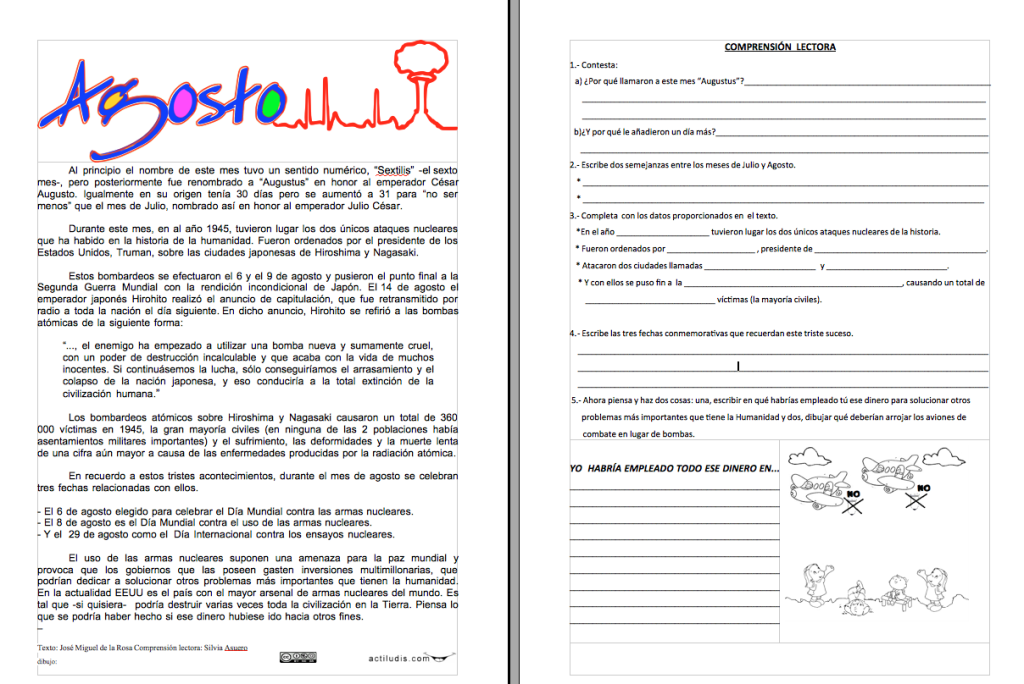 La lectura con preguntas de comprensión de nuestra serie de los meses del año, esta vez, dedicada a agosto, no se centra tanto en las curiosidades y anécdotas,… como sí en los eventos que tuvieron lugar en éste mes y que puedan interesar a la vez que ayuda a nuestro alumnado a concienciarse sobre la guerra. Aunque están preparadas para realizar a partir del Segundo Ciclo de Primaria, por el vocabulario que se usa puede ser mas apropiado a partir del Tercer Ciclo de Primaria.