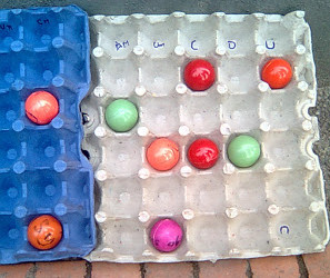 Se escribe en la primera fila superior de la huevera las U, D, C, UM, DM, CM…y a cierta distancia se lanzan las bolas, anotando el número que se logra en el cuaderno.