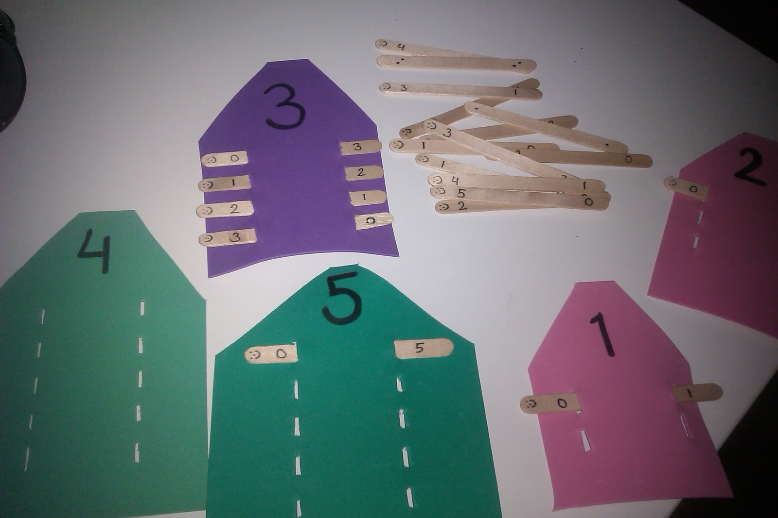 Procedimiento: Necesitamos depresores en los que escribir en los extremos las descomposiciones numéricas y goma eva para las bases, a las cuales les haremos hendiduras paralelas para poder introducir los depresores.
