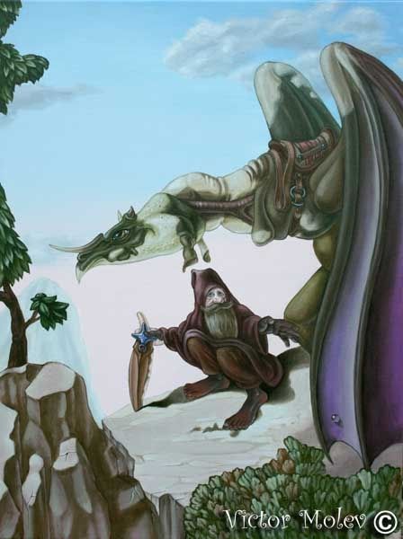 Inspirada en las novelas clásicas de la alta fantasía «El hobbit» o «El Señor de los Anillos» del escritor J.R.R. Tolkien, el artista surrealista y fantástico, de origen ruso, Víctor Molev creó esta obra en la que además de la montura voladora y de su jinete elfo hay algo más. ¿Sabrías decir qué?.