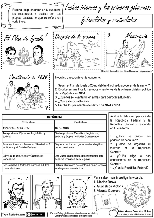 Jesús González Molina de la Escuela Primaria Vicente Guerrero, desde Los Placeres del Oro, Guerrero, México, nos remite para compartir con el profesorado de su país, una ficha con actividades luchas internas y los primeros gobiernos tras la independencia, tanto federalistas como centralistas.