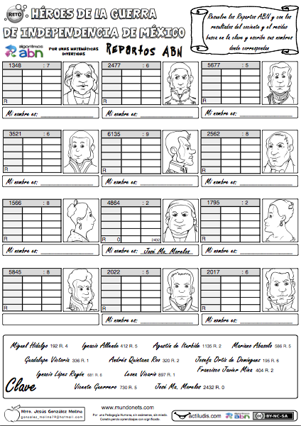 Jesús González Molina de la Escuela Primaria Vicente Guerrero, desde Los Placeres del Oro, Guerrero, México, nos remite para compartir con el profesorado de su país y aquellos que lo deseen, una ficha con repartos (divisones) de 4 cifras entre 1 con el motivo de los personajes que hicieron historia en la independencia de México que se celebra el 16 de Septiembre.