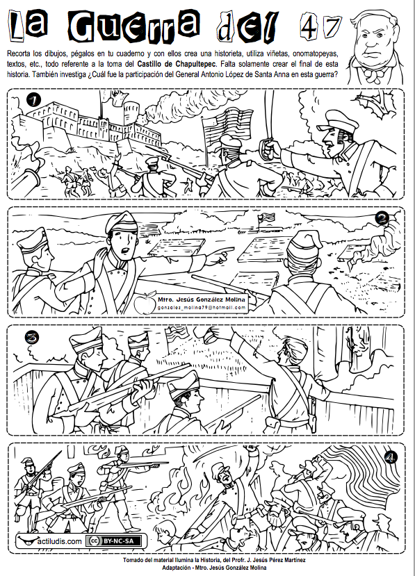 La siguiente lámina, con la que se trabaja historia y la elaboración de textos, es una adaptación realizada por Jesús González Molina de la Escuela Primaria Vicente Guerrero, desde Los Placeres del Oro, Guerrero, México sobre un material del Prof. J. Jesús Pérez Martínez. En ella se le pide al alumnado que recorta los dibujos, pegue en tu cuaderno y con ellos cree una historieta, utilizando viñetas, onomatopeyas, textos, etc., todo referente a la toma del Castillo de Chapultepec y en la que falta solamente crear el final de esta historia.