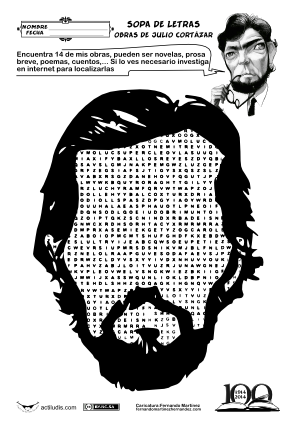 La siguiente sopa de letras contiene 14 obras literarias de Julio Cortázar, entre novela, prosa breve, poesía, cuentos,… Para que aprovechen más la ficha podemos pedirles que investiguen previamente todas las obras de julio Cortázar y que posteriormente busquen cuantas están en la sopa de letras.