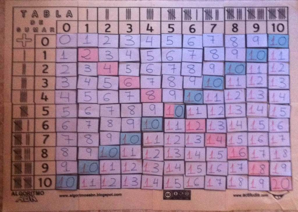 La tabla la ha impreso en folios de colores y la tarjetas de los números son independientes para ir poniéndolos a media que vamos viendo la progresión de los números e ir pegándolos con goma de pegar, celo, velcro…
