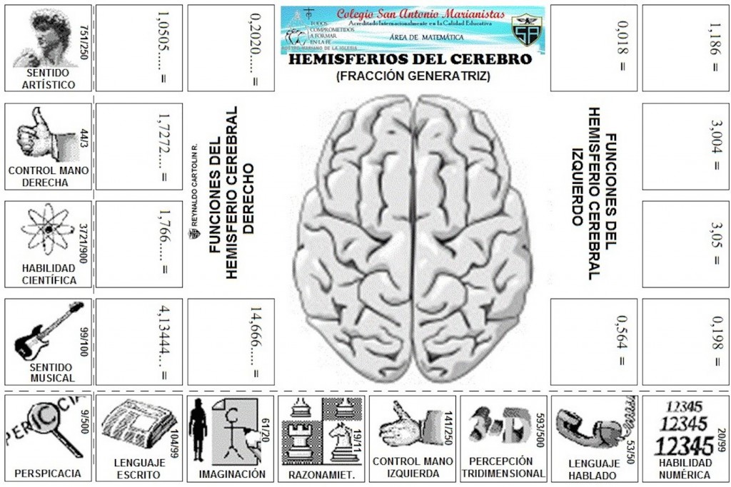 Una original y preciosa ficha realizada por Reynaldo Oswaldo Cartolín Rosado Profesor de Matemática – Física desde el Colegio San Antonio Marianistas del Callao, Lima (Perú), en la que se trabaja la búsqueda de la fracción generatriz de varios números decimales, con el gancho de distintas actividades según el hemisferio cerebral en el que se encuentran localizadas.