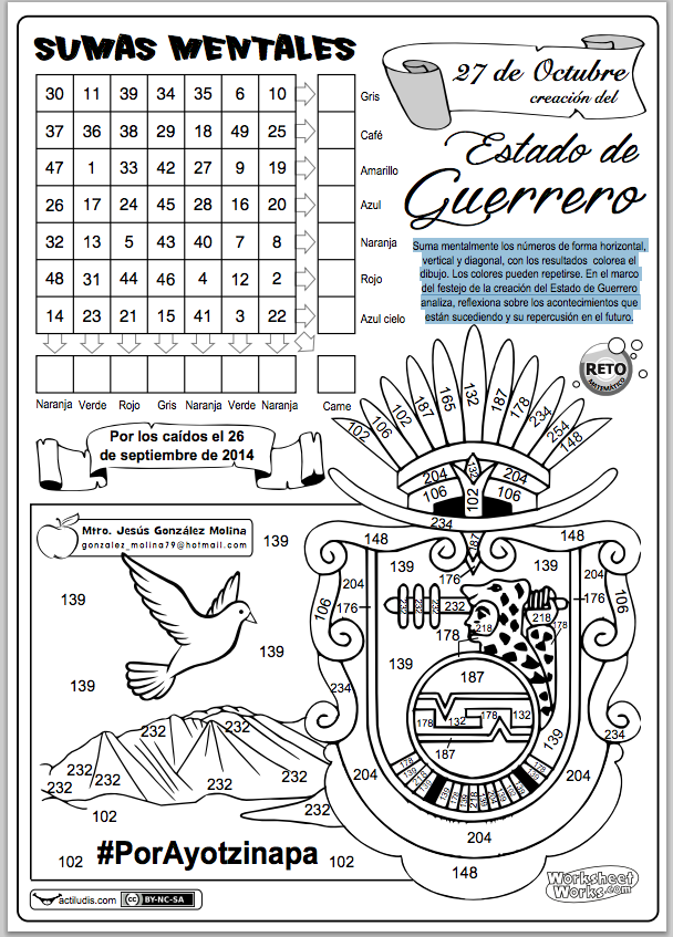 Para ello ha elaborado una ficha en la que se realizan sumas mentales de números dispuestos de forma horizontal, vertical y diagonal en un cuadrante, cuya solución proporciona los colores con los que pintar el escudo del Estado de Guerrero.