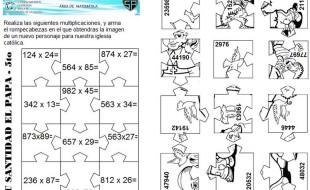 En esta ficha que nos remite el Profesor de Matemática – Física, Reynaldo Oswaldo Cartolín Rosado desde el Colegio San Antonio Marianistas del Callao, Lima (Perú), se trata de realizar productos de 3 cifras en el multiplicando y 2 en el multiplicador con cuyos resultados montar un puzzle para descubrir un personaje. En esta … Sigue leyendo Producto de 3 por 2 cifras V