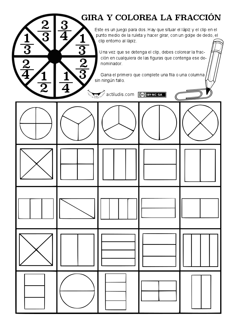 El juego consiste en poner un clip y la punta de un lápiz en el centro de la ruleta y hacer girar el clip con un golpe de dedo. Donde se pare el jugador debe buscar una pieza en la que pueda colorear dicha fracción.