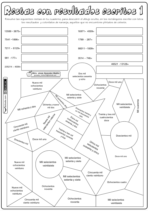 En esta ocasión Jesús González Molina Esc. Primaria “Vicente Guerrero” de Los Placeres del Oro, Guerrero, México, nos envía una ficha para trabajar la restas con millares, cuyas soluciones aparecen desordenadas y por escritos en un dibujo oculto.