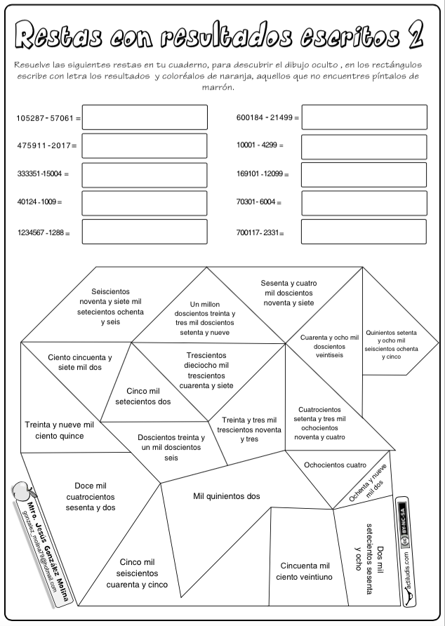 Jesús González Molina Esc. Primaria “Vicente Guerrero” de Los Placeres del Oro, Guerrero, México, nos envía una nueva ficha para trabajar la restas con millares, cuyas soluciones aparecen desordenadas y por escritos en un dibujo oculto.