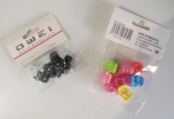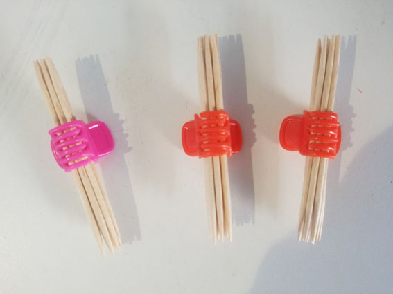 Quizás el más cómodo de usar para el alumnado de Educ. Infantil por la existencia de pinzas de pequeño tamaño con forma de abrazadera con «dedos». Este material permite abrir y cerrar fácilmente la pinza para sujetar los palillos. Al igual que con las gomas elásticas, si se dispone de pinzas rojas mejor, aunque el color no es propiedad inherente a la decena.