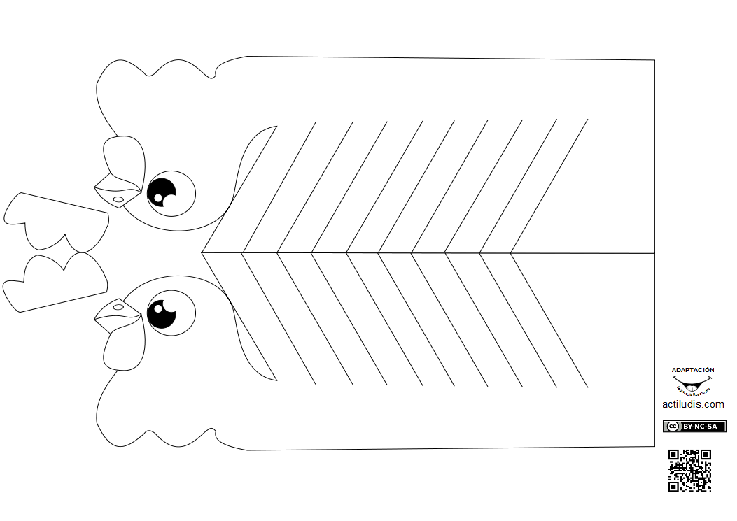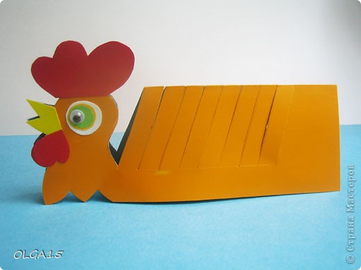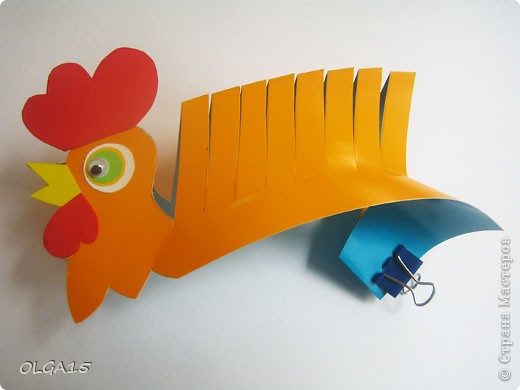 En todo caso una vez recortada y doblado por el eje de simetría debemos proceder a doblar la parte posterior hacia dentro y meter dentro de la base de la cabeza del gallo o gallina, pegar y sujetar con la pinza hasta que se seque, lo cual hará que el cuerpo quede abierto y mostrando las tiras recortadas.