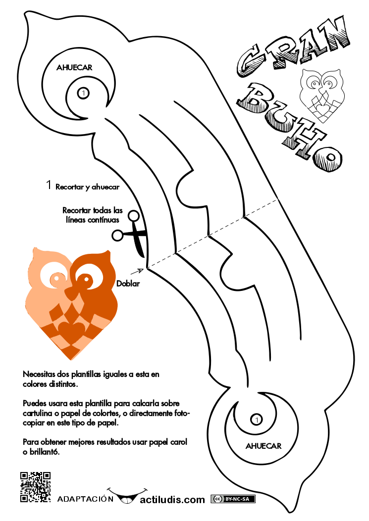 Nueva manualidad al estilo de los corazones entrelazados que presentamos hace unos días. En esta ocasión se trata de un gran búho que también se hace entrelazando la piezas de las dos plantillas necesarias y que vi en la página danesa «Fru kubiks laekkerier«