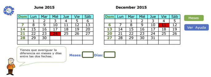 Para empezar debes hacer clic en el botón «Meses» y la aplicación generará al azar, en cada calendario un mes y un día, el fondo de la celda se pintara de rojo. Cuando tengas el cálculo en meses y días los ingresas en los recuadros de contorno verde. Si la respuesta es correcta el fondo de la celda se pintara de verde.