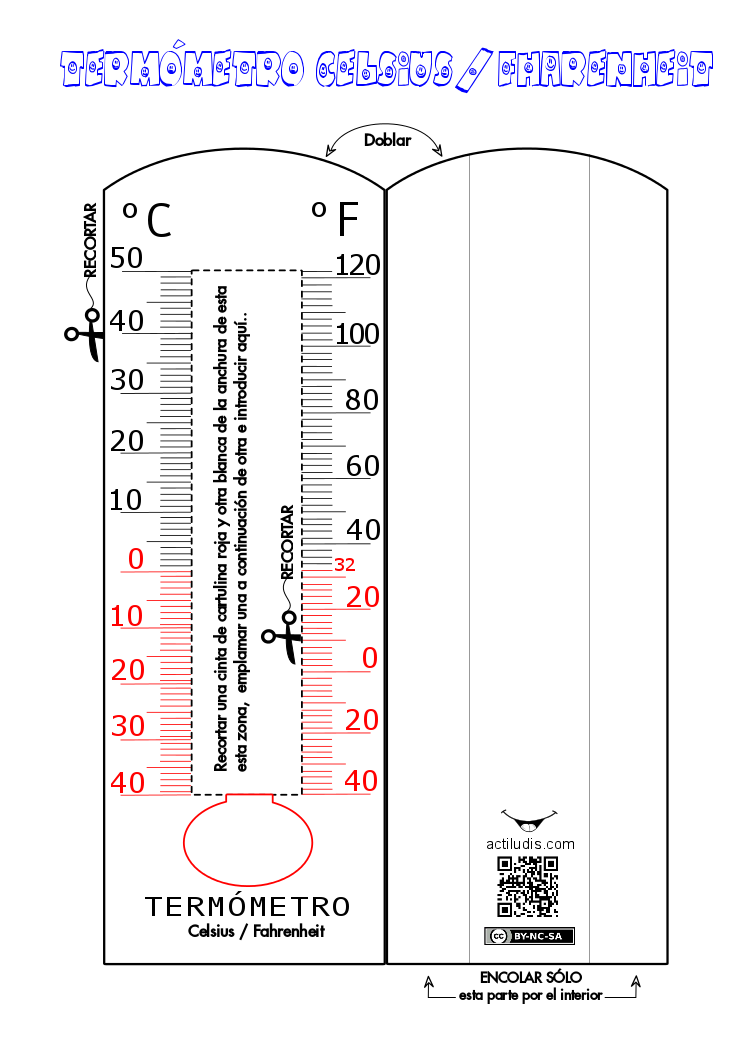 Con la siguiente ficha no sólo nos construimos un termómetro para practicar las temperaturas, si no que también podemos usarla para realizar conversiones del sistema Celsius al Fahrenhait y viceversa. También podemos hacer directamente preguntas del tipo: