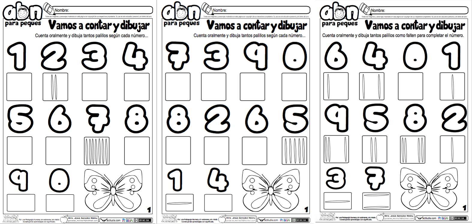 Ficha para los más pequeños en la cual deben dibujar la cantidad expresada en el número. Podemos pedirles que la realicen ordenadamente, sin un orden preestablecido como la segundo ficha o que completen los palillos que faltan en cada número dependiendo del estado de la cadena numérica en la que se encuentre el alumnado.