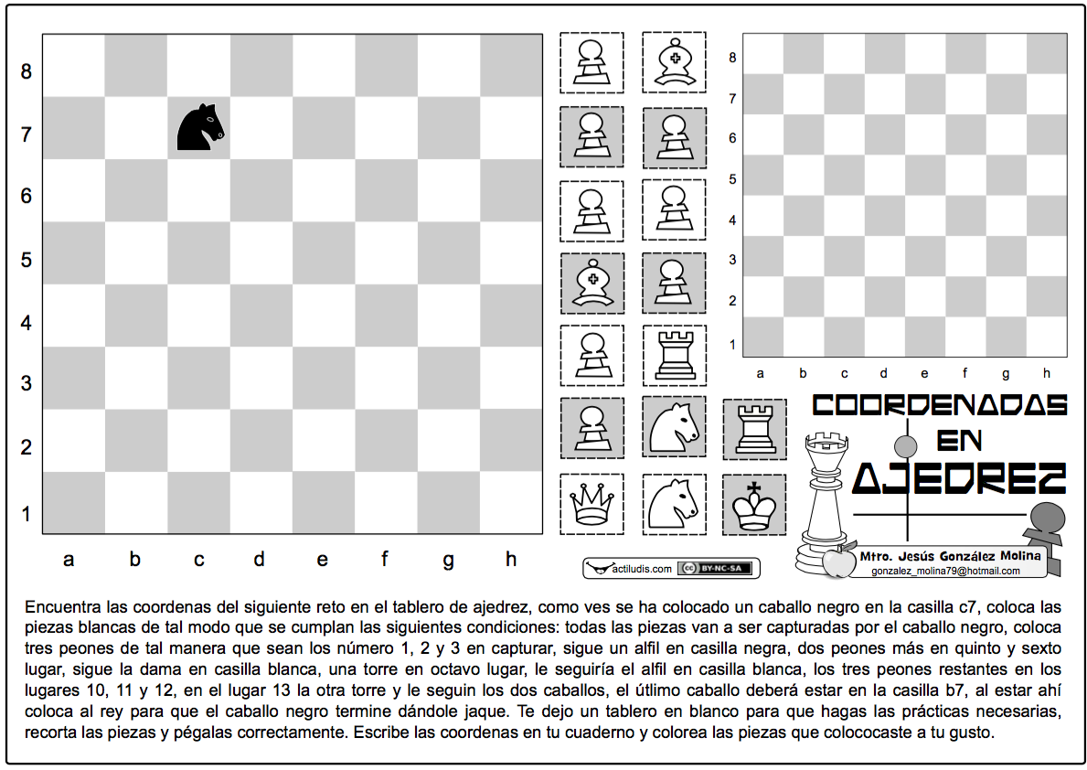 Jesús González Molina de la Escuela Primaria Vicente Guerrero, desde Los Placeres del Oro, Guerrero, México, nos propone seguir trabajando las coordenadas en el plano pero esta vez con el ajedrez. Para ello da una serie de instrucciones de dónde deben colocar cada una de las piezas y una vez recortadas y pegadas las piezas escribir en el cuaderno las coordenadas en el tablero de cada una de ellas.