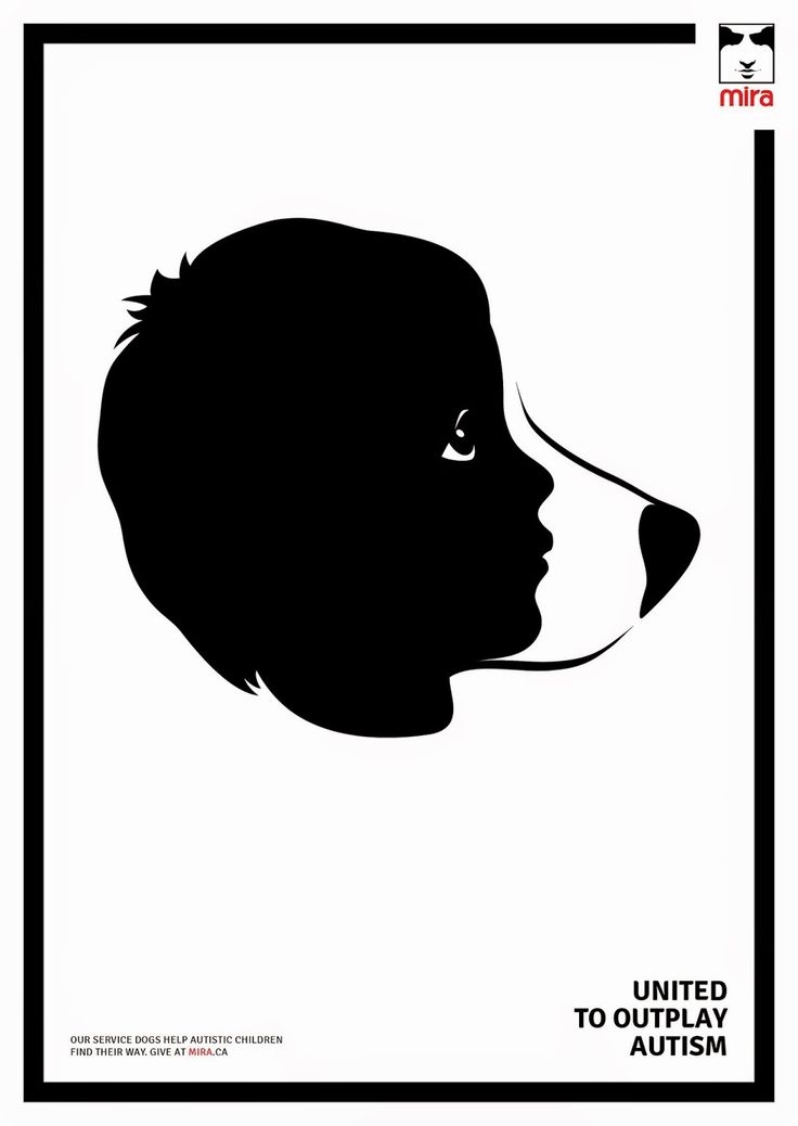 La fundación MIRA dedicada al entrenamiento y uso terapéutico de perros para el tratamiento de niños autistas y perros guía para niños invidentes, tiene como logotipo la primera imagen que os dejamos en la que se juega con la idea visual de uno de los objetivos de la organización, y en la segunda imagen encontramos su otro objetivo y cuya imagen descubrí a través del blog «Espejo Lúdico«.