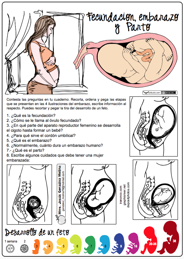 En la ficha “Fecundación, embarazo y parto” realizada por Jesús González Molina de la Escuela Primaria Vicente Guerrero, desde Los Placeres del Oro, Guerrero, México, se plantean dos actividades diferentes. Una primera en la cual deben contestar una serie de preguntas a modo de investigación sobre la fecundación humana y un segunda en la que recortarán cuatro etapas del crecimiento del feto para pegarlas en el cuaderno y explicar su desarrollo.