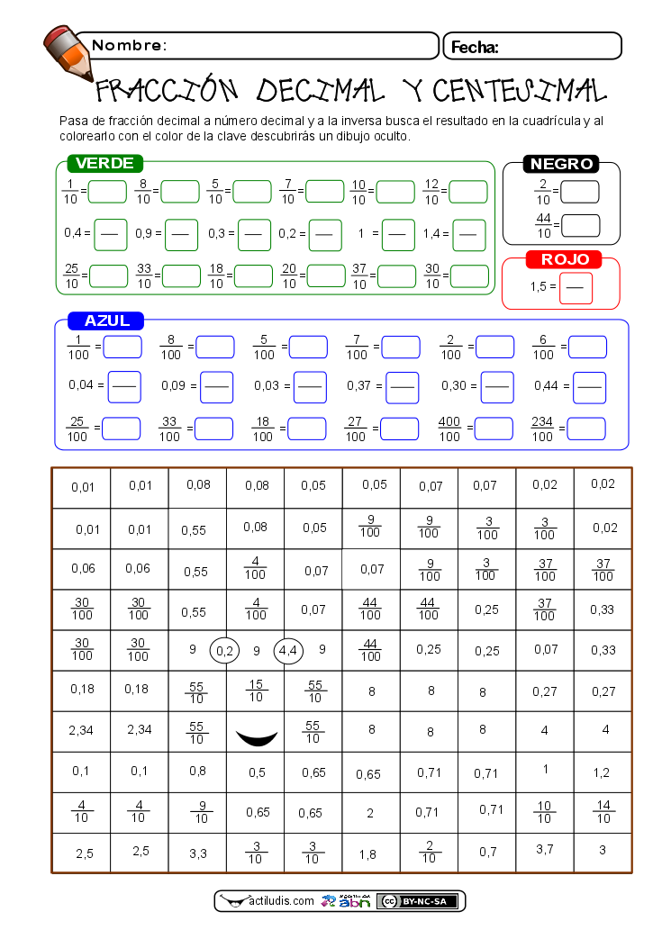 Con esta ficha dedicada al cálculo de fracciones decimales y centesimales repasamos y afianzamos la comprensión del alumnado con este tipo de fracciones. Para ello se le pide la expresión decimal de la fracción tanto decimal como centesimal y la inversa, es decir conocida la expresión decimal que la exprese mediante fracción.