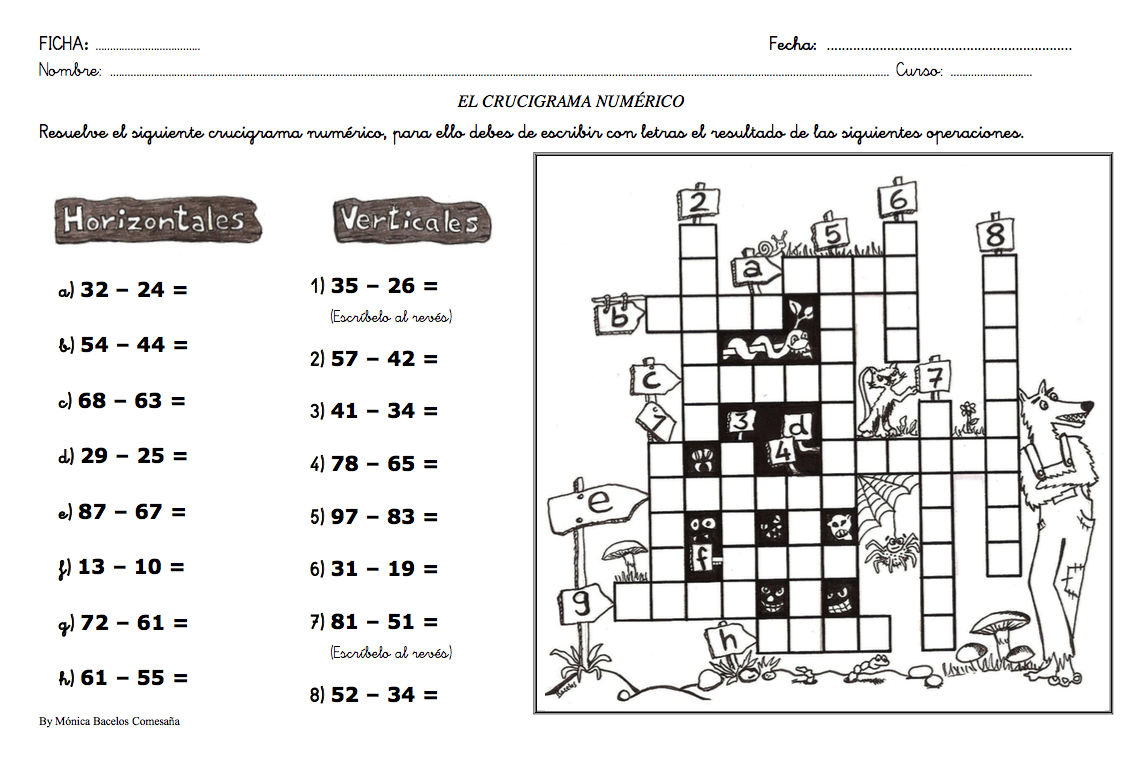 En esta actividad «Crucigrama numérico» realizada por Mónica Bacelos Comesaña de Coruxo en Vigo (Pontevedra) se trabajan sumas y restas con números de dos cifras. Los resultados son lo que hay que escribir en letra en el crucigrama.