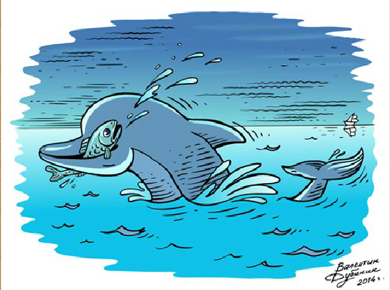 Esta imagen titulada «Delfín y pez» es del humorista gráfico y caricaturista ruso Valentin Dubinin, en ella nos muestra un delfín con un pez en la boca. Los delfines como mamíferos empiezan su vida tomando la leche de la madre, pero su boca con el tiempo se puebla de afilados dientes que le permiten comer peces, calamares y hasta crustáceos que puedan romper con su mandíbula.