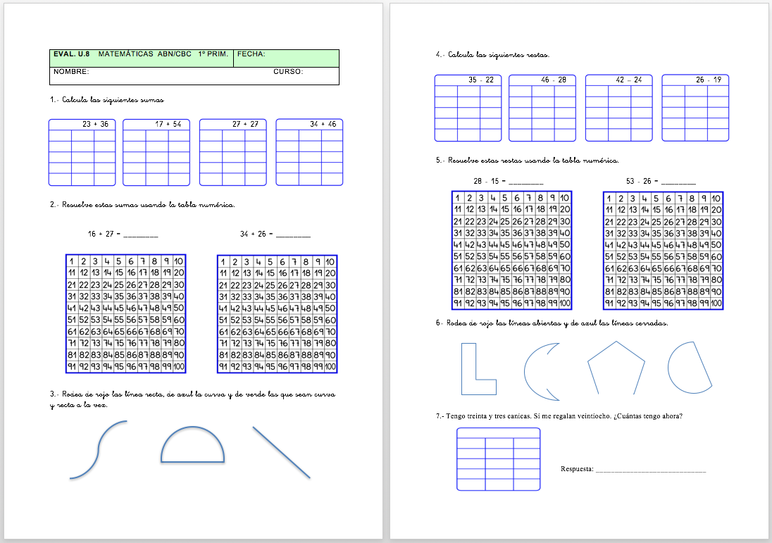 Evaluación Unidad 7 Matemáticas ABN de 1º / 2º