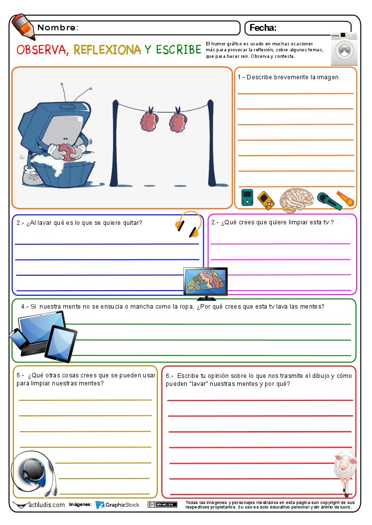 Una nueva actividad que busca fomentar la creación de textos. En esta ocasión usamos otra imagen de un chiste gráfico que más que provocar la risa busca la reflexión sobre temas que al alumnado pasan desapercibidas y a través de una serie de preguntas sobre lo que ven en ella se les va guiando hacia la creación de un texto que englobe lo observado así como poder llegar a dar una opinión crítica del mismo.