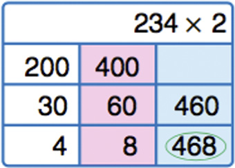 6.- Números de tres cifras que no supere ninguna de ellas el 5 y el multiplicando sea siempre 2. Con este paso algún alumnado puede necesitar una columna más de apoyo para reflejar los productos parciales. Por ejemplo 2 x 123, 2 x 234, 2 x 354…