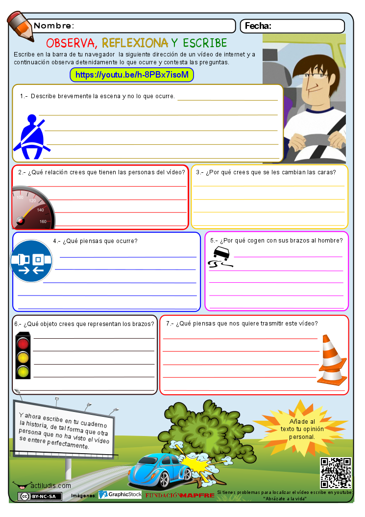 Una nueva actividad que busca fomentar la creación de textos. En esta ocasión usamos el vídeo «Embrace Life – always wear your seat belt» (¡Abraza la vida! use siempre el cinturón de seguridad) de una campaña de seguridad vial de la empresa inglesa «Sussex Safer Roads» y que dejamos en este artículo para que a través de una serie de preguntas sobre lo que ven se les va guiando hacia la creación de un texto que englobe lo observado así como una opinión personal y crítica del mismo.