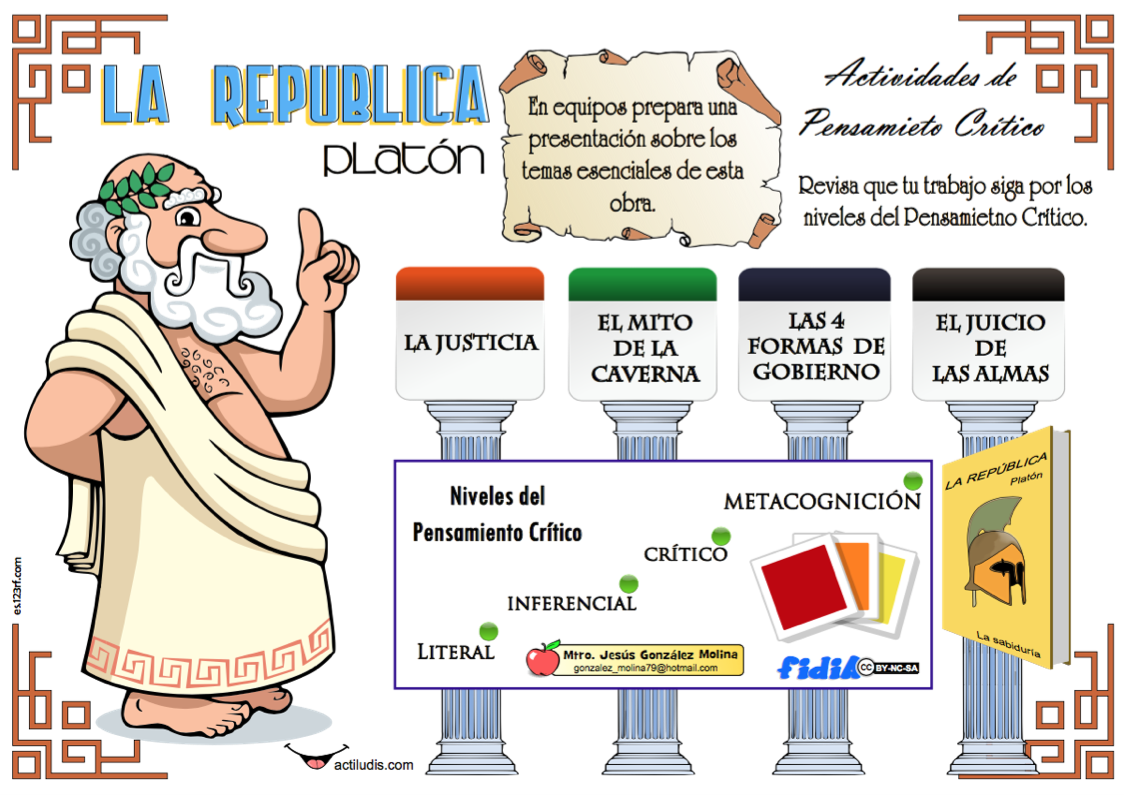 El profesor Jesús González Molina de la Escuela Primaria Vicente Guerrero y catedrático en el nivel de posgrados, desde Los Placeres del Oro, en el estado de Guerrero, México, nos envía una actividad en la cual les pide que realicen, en equipo, una presentación sobre la obra de Platón «La República» en la que sigan los niveles del pensamiento crítico.