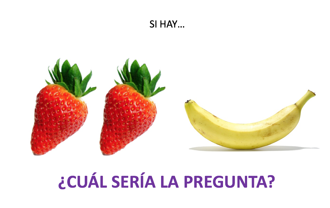 Por ello son problemas que tanto en Infantil, Primer Ciclo y Educación Especial podemos usar para trabajar otros elementos del problema interesantes como es la búsqueda de una pregunta que combine ambas cantidades. Se trata en esta actividad de encontrar algo en común entre las cantidades que se les muestran para poder reunir en una sola ambas cantidades. En la imagen que se ilustra abajo la pregunta que las reúne en una sola cantidad a las fresas y al plátano, es que ambas son frutas, por tanto las posibles preguntas serían: ¿Cuántas piezas de fruta hay? o ¿cuánta fruta hay?