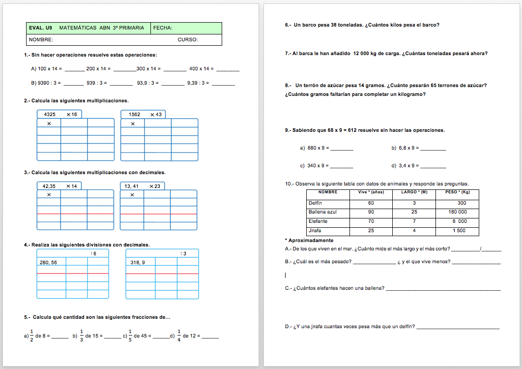 Evaluación Unidad 8 Matemáticas ABN de 3º